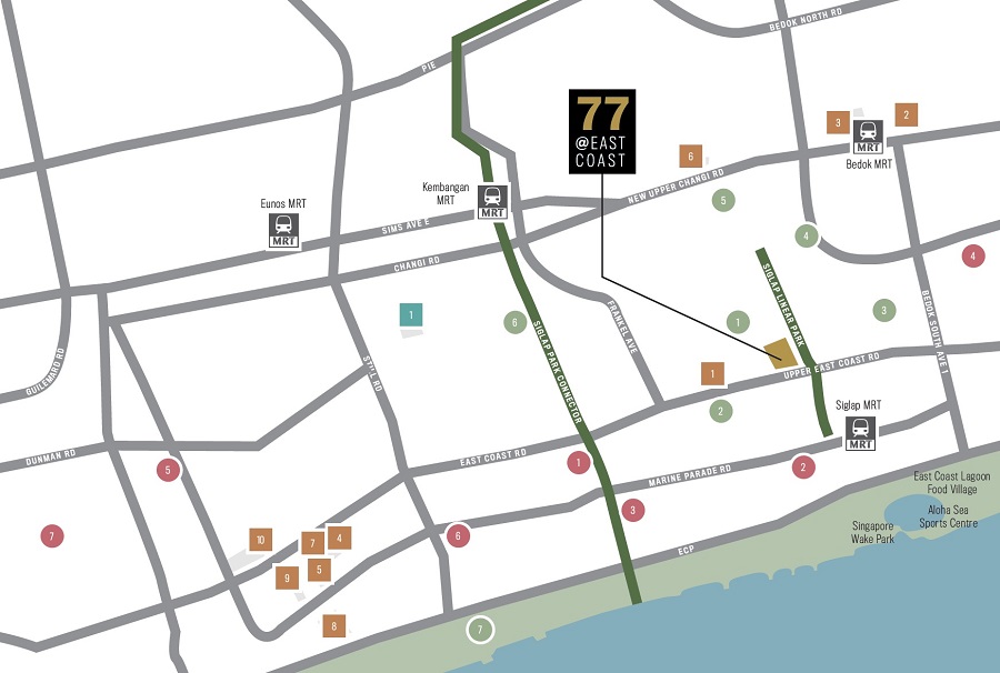 77 at East Coast is about 490m to the upcoming Siglap MRT station (Thomson-East Coast Line) which is due to open in 2023.