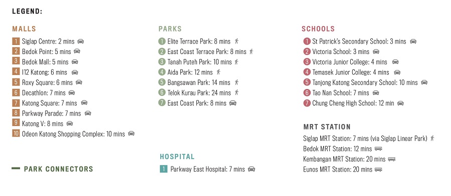 | Food Galore Conveniences Surrounded by a myraid of eateries, restaurants and cafe. Near famous hawker fare including East Coast Lagoon Food Village, Jumbo Seafood and Long Beach Seafood centres. Also enjoy Delectable Peranakan cuisines in the nearby Joo Chiat and Katong areas |