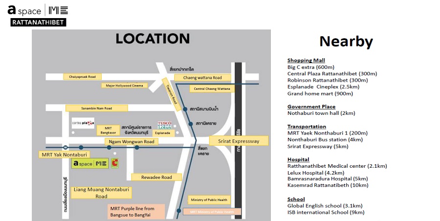 | Shopping Mall: Big C Extra (600m) Central Plaza Rattanathibet (300m) Robinson Rattanathibet (300m) Esplanade Cineplex (2.5km) Grand home mart (900m) |
