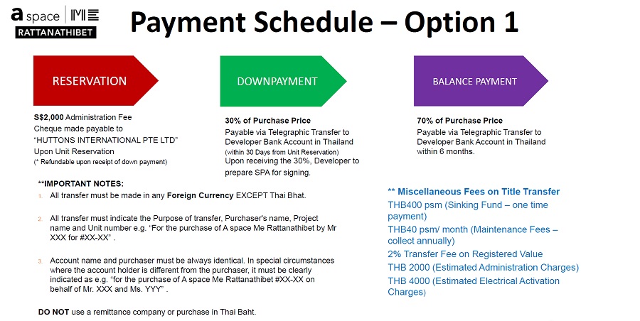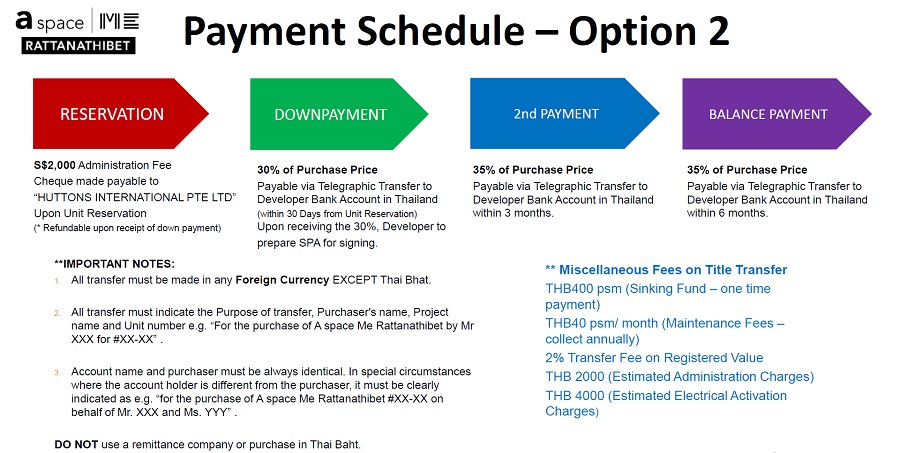 All TT transfers must indicate the purpose of transfer, purchaser's name, project name and unit number e.g. "for the purchase of A Space ME Rattanathibet #22-02" Account name and purchaser must be always identical. In special circumstances where the account holder is different from the purchaser, it must be clearly indicated as e.g. "For the purchase of A Space ME Rattanathibet #22-02 on behalf of Mr. X". DO NOT use a remittance company or purchase in Thai Baht.