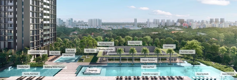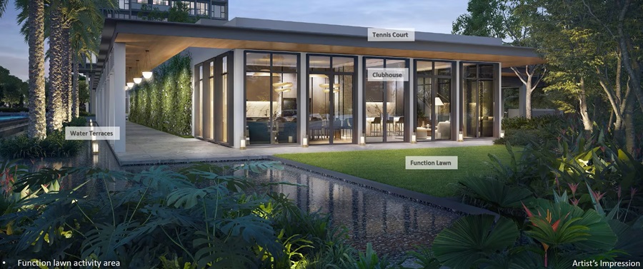 | Full condominium facilities including tennis court and 50 meter lap pool - resort-style facilities inspired by the timeless charm of the neighbouring black-and-white colonial houses |