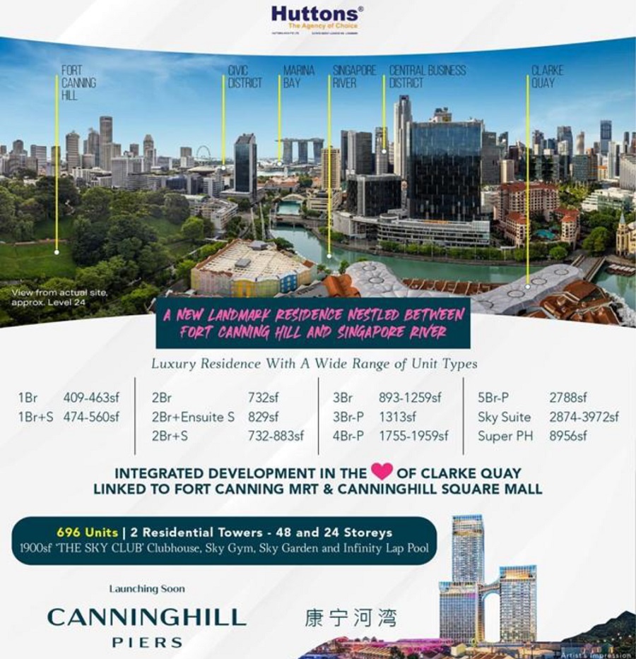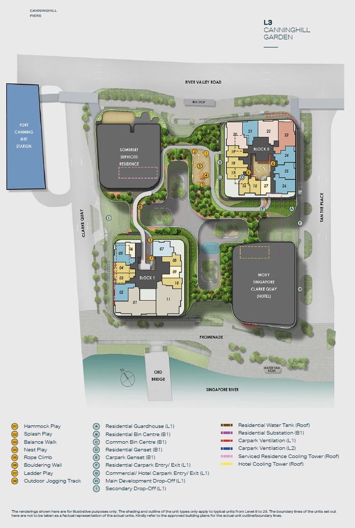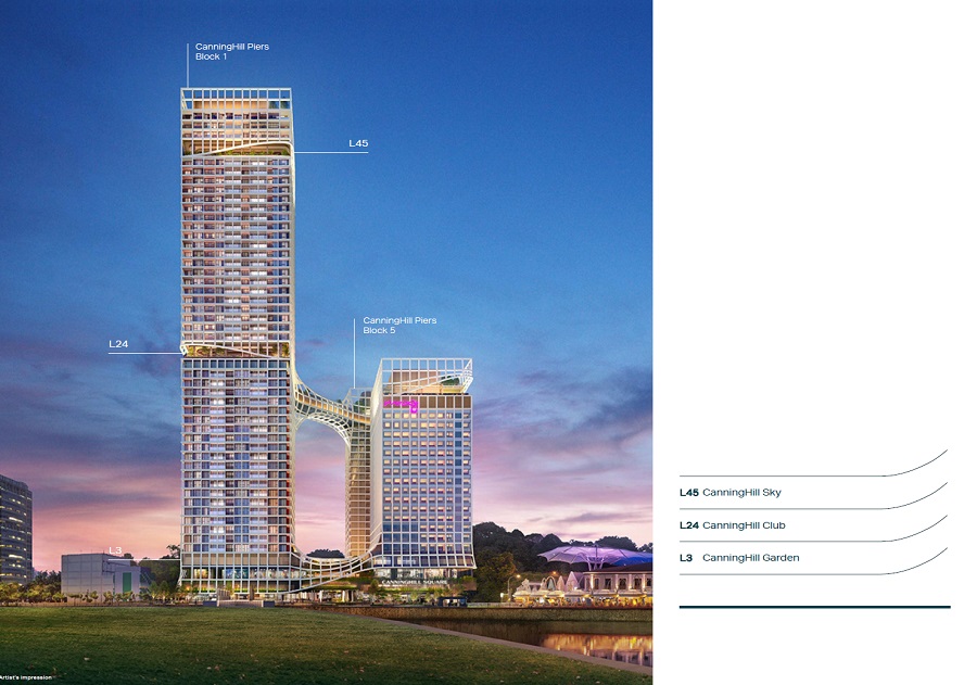 With a total gross floor area (GFA) of 100,263 square metres (sqm), Canning Hill Piers & CanningHill Square will comprise two residential towers (48-storeys and 24-storeys) offering 696 apartment units, a commercial component, a 21-storey hotel (Moxy by Marriortt) and a 20-storey serviced apartments (Somerset Service Residences). CanningHill Square sits on a prime site with a coveted dual-frontage facing Singapore River and Fort Canning Hill.