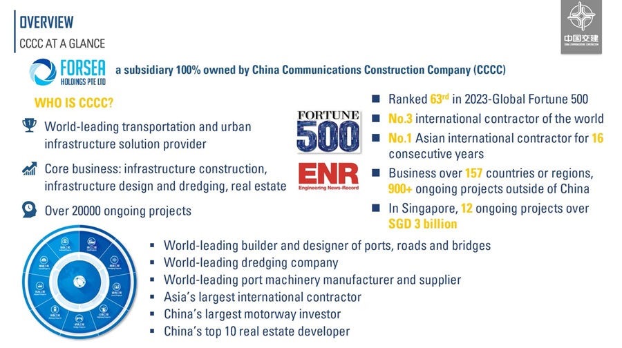 Forsea Holdings, a subsidiary of China Communications Construction Company (CCCC), excels in global transportation infrastructure investment, including ports, highways, bridges, and airports. CCCC, ranked 63rd in the Global Fortune 500, operates in 157 countries with 900+ ongoing projects. CCCC Singapore Branch manages 12 projects over SGD 3 billion, spanning airport and transit construction, design, solar installation, and real estate, like Changi East and Johor Bahru Singapore Rapid Transit.