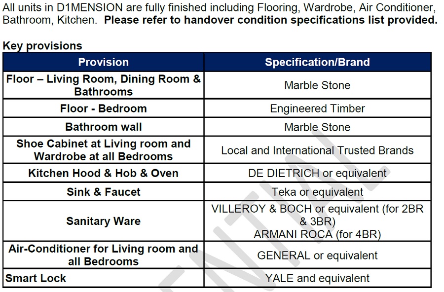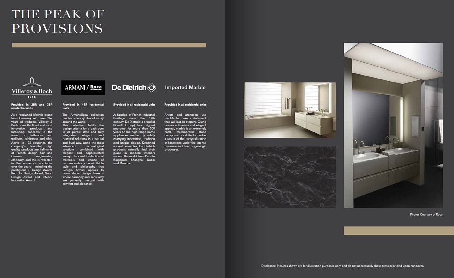 The Peak of Provisions When it comes to making a mark, D1MENSION is a clear extension of who you are and where you need to be. Fitted with exceptional interiors and tasteful fixtures and fittings such as marble flooring, and world-renowned brands such as Villeroy & Boch sanitary ware in 2BR and 3BR apartments, ARMANI ROCA sanitary ware in 4BR apartments, and designer kitchen by De Dietrich.