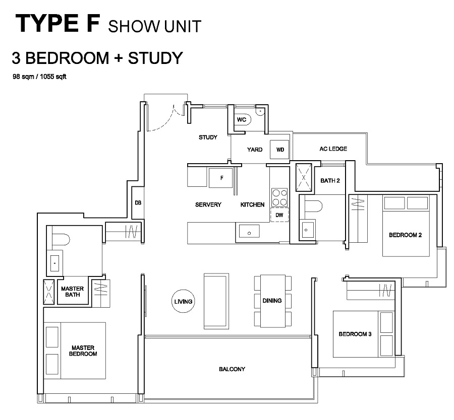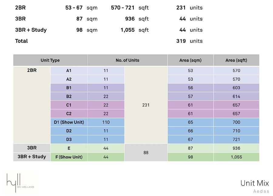 | 319 Exclusive Units comprising 2 Bedrooms (570-721 sqft), 3 Bedrooms (936 sqft) and 3 Bedrooms + Study (1055 sqft) |