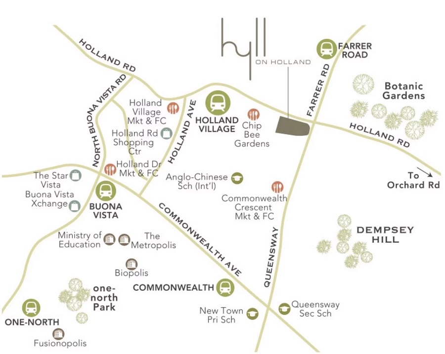 Hyll on Holland is well connected with the rest of Singapore via major expressways PIE (Pan Island Expressway) and AYE (Ayer Rajah Expressway). Driving to the Downtown takes less than 20 minutes via the AYE. Other transportation options include bus and MRT. It takes less than 10 minutes' walk to reach Holland Village MRT Station, which is only one stop from Buona Vista MRT Station, the interchange of Circle Line and East-West Line, making it accessible to the western part of Singapore. The MRT Station is only two stops away from Botanic Gardens, the interchange of Circle Line and Downtown Line.
