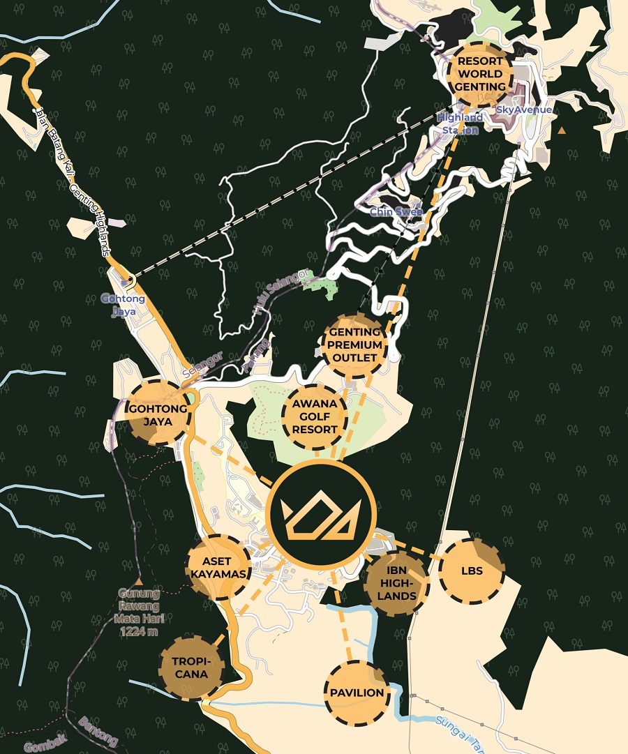 云顶高原位于距离吉隆坡约33公里的山林雨林中,因凉爽的气候、热闹的娱乐和高端的房地产机会而成为热门的周末度假胜地。高原城市位于云顶高原顶峰以下5公里处,近年来经历了快速发展,导致山谷内出现了许多新的商业区和高端公寓。金钟公园位于周围居住、商业、教育和娱乐区的中心位置,地理位置优越。