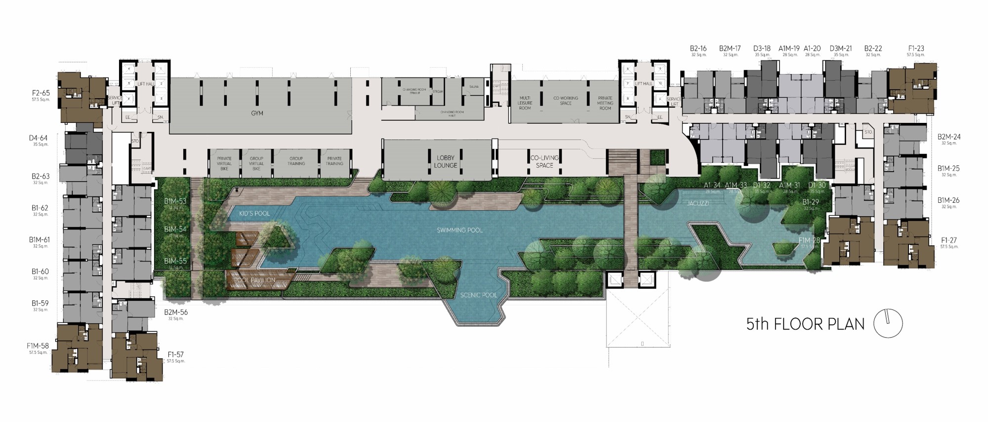 5th floor: Garden, Swimming Pool, Scenic Pool, Kid's Pool, Sauna, Stream, Co-Working Space, Private Meeting Room, Multi Leisure Room, Co Living Space, Social Lounge, Gym