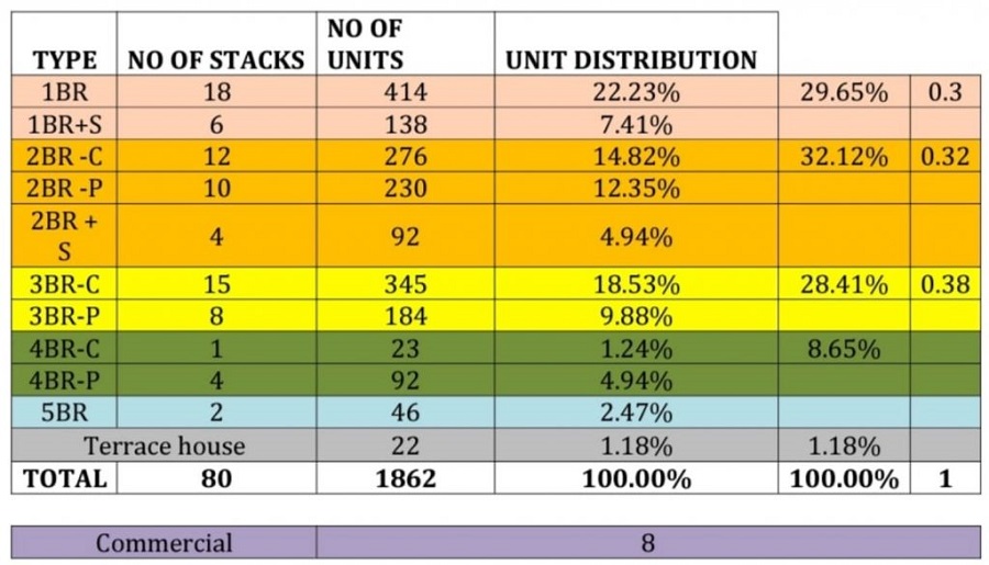 Number of Units : 1,862 Residential Units comprising 1840 units in 9 blocks of 24 storeys, and 22 units of 2-storey Strata Landed Terraces. 1 Restaurant and 8 retail shops