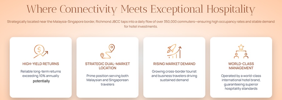 High demand for accommodation as the volume of visitors to JB increases. With the lack of hotels in the area, Richmond JBCC will meet the needs of business travelers and leisure travelers looking for a luxurious service apartment well-managed by a renowned international service residence operator