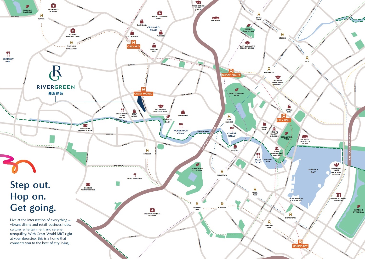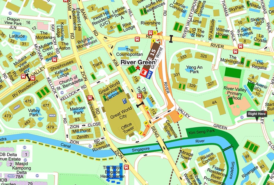 River Green is exceptionally well-connected with Great World MRT Station located just beneath the development. The Thomson-East Coast Line offers quick access to major destinations such as Orchard, Outram Park, and Marina Bay. Residents also benefit from nearby bus services along River Valley Road and Kim Seng Road, while drivers enjoy seamless access to the Central Expressway (CTE) and Ayer Rajah Expressway (AYE).