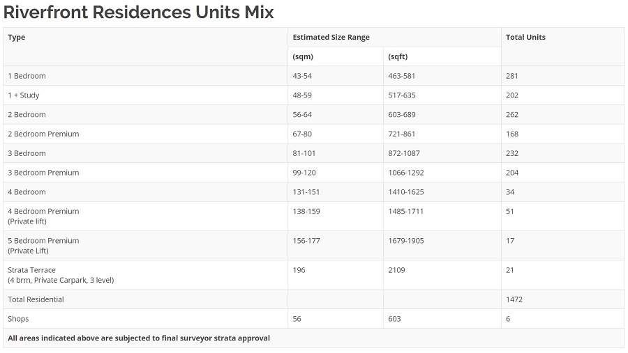 Riverfront Residences offers 1,472 residential units, ranging from 1 to 5 bedroom apartments as well as strata houses. Majority of the units enjoy the luxury of fronting the river. The 4 and 5-Bedroom Premium also comes with private lift. Click on the unit types below for the Floor Plans.