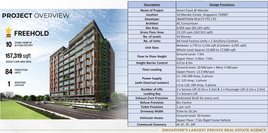 Smart Food @ Mandai is a rare Freehold 10-storey ramp up B2 multi-user food factory located at 10 Mandai Estate, Singapore 729907. With a gross floor area of 157,319 square feet, the Freehold Smart Food at Mandai food factory comprises 84 food production units and 1 industrial/ancillary canteen. The ceiling height of each unit ranges from 5.95 meters to 7 meters high on the 1st & 10th storeys.