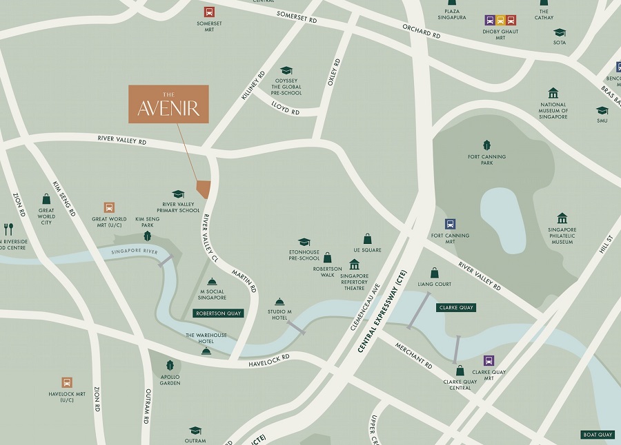 The Avenir @ River Valley is accessible via the nearest train stations Great World MRT (TE15) Thomson-East Coast Line (due for completion by 2021), Somerset MRT (NS23), and Havelock MRT (TE16) Thomson-East Coast Line (due to complete by 2021).