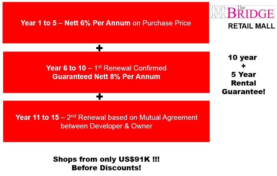 THE BRIDGE Retail Mall Shops opposite upcoming Shangri-La - 70% Nett Guaranteed Rental Returns over 10 Years by Singapore Developer Oxley, listed on SGX (Singapore Stock Exchange)