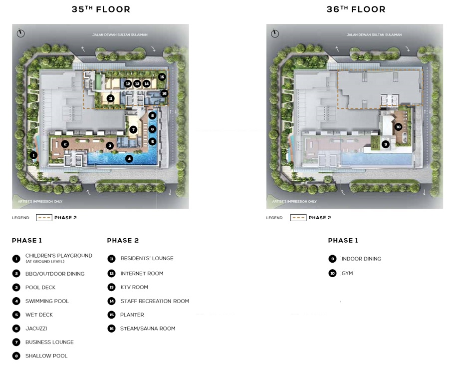 2 Levels of Facilities (35th and 36th Floor). Children's Playground, BBQ/Outdoor Dining, Pool Deck. Swimming Pool, Wet Deck, Jacuzzi, Business Lounge, Shallow Pool, Residents' Lounge, Internet Room, KTV Room, Staff Recreation Room, Planter, Steam/Sauna Room