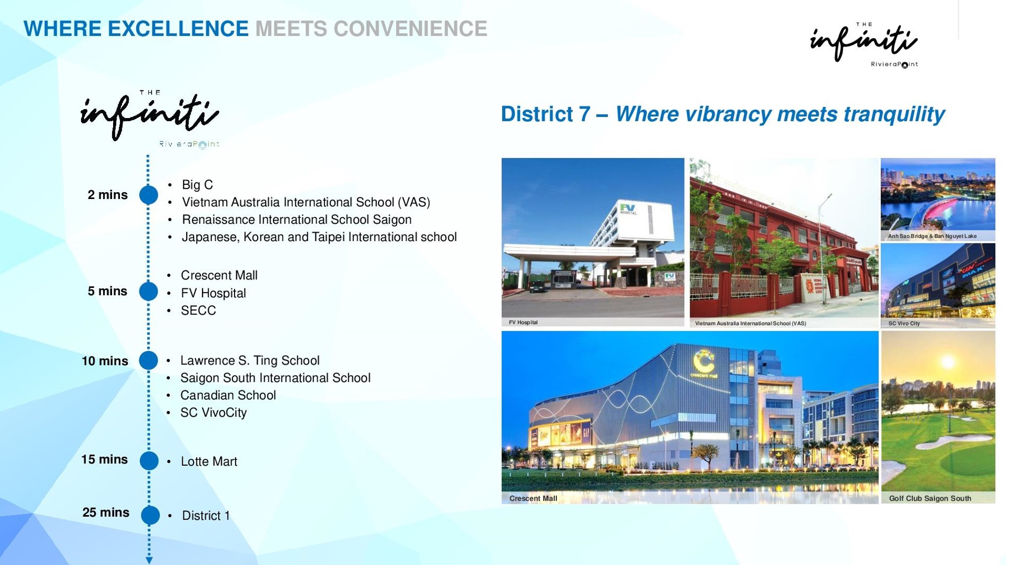 Why Invest in District 7 (The Infiniti Riviera Point)![]() Enjoy spectacular river, city and swimming pool views! Only 15 minutes to the CBD in District 1, 3 minutes to Phu My Hung, near upcoming Metro/MRT line, shopping malls, international schools & medical centers Attractive pricing from only US$1xxK! Own the best Vietnam property from just 10% Cash Upfront!