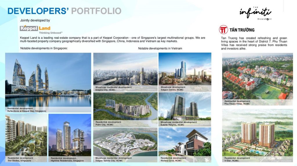 The Infiniti Riviera Point Quality Finishing by World-Class Singapore developer Keppel Land![]() ![]() ![]() ![]() ![]() ![]() ![]() ![]() ![]() ![]() ![]() ![]() Enjoy spectacular river, city and swimming pool views! Only 15 minutes to the CBD in District 1, 3 minutes to Phu My Hung, near upcoming Metro/MRT line, shopping malls, international schools & medical centers Attractive pricing from only US$1xxK! Own the best Vietnam property from just 10% Cash Upfront!