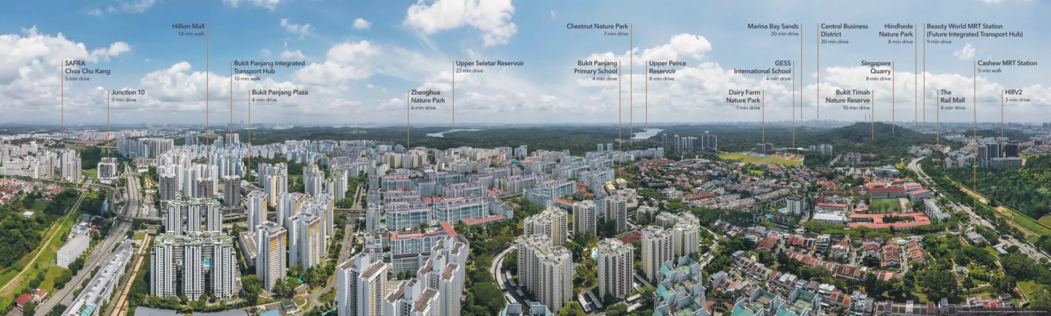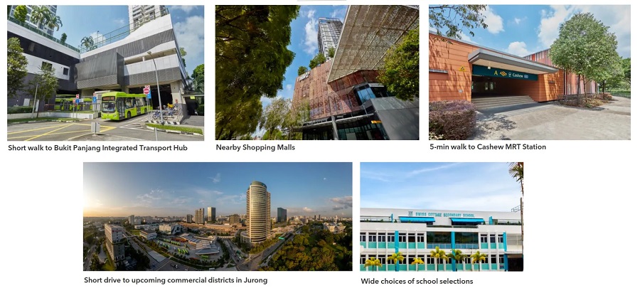 The area is also well-connected to public transport networks, with the Cashew MRT station on Singapore's Downtown Line just 5 minutes' walk away. The old Bukit Timah railway station is within a 13-minute walk. There are also many schools, commercial spaces and parks in the vicinity, making the area convenient for its residents.