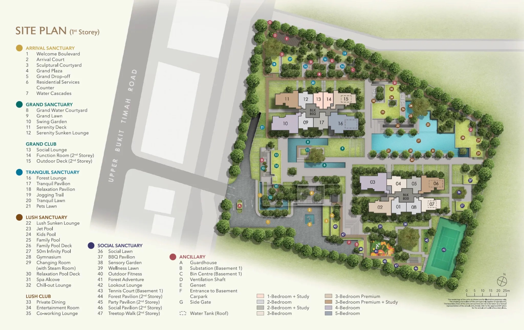 Luxurious Full Condominium Facilities including tennis court, 2 clubhouses, 50-meter infinity pool, water courtyard, sunken lounge and treetop walk