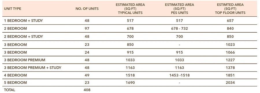 Number of Units : 408 Units over 2 Towers of 24-Storeys High, comprising 1 Bedroom + Study to 5 Bedrooms
