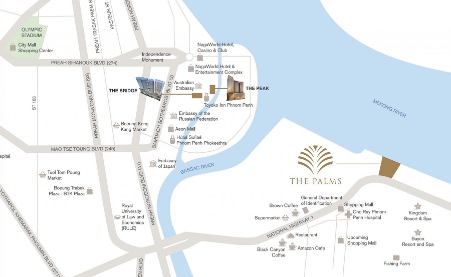 The Palms is located within a district which is a major commercial centre where restaurants, hotels, entertainment joints, sports clubs, transportation hubs, tourism sites, markets, shopping centres, banks and other conveniences are located. The Palms Cambodia is located about 30-40 minutes (depending on traffic) from the Phnom Penh International Airport and within 20-30 minutes to the Phnom Penh Railway Station and AEON Mall 1 and 2. AEON Mall 3 is being constructed now, to the south of The Palms.
