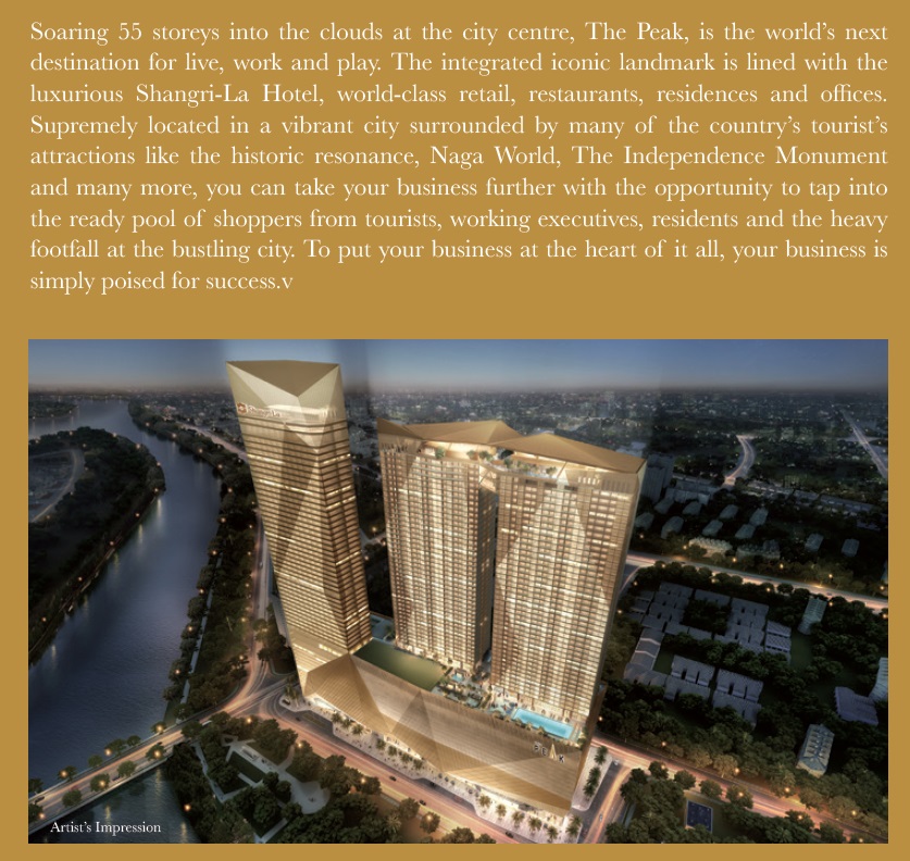 The Peak Shoppes Commercial Retail Mall Cambodia (Phnom Penh) Shops, Luxury Apartments & Offices with the luxurious Shangri-La Cambodia Hotel next door. Register now as our VVIP to enjoy best discounts direct from developer.
