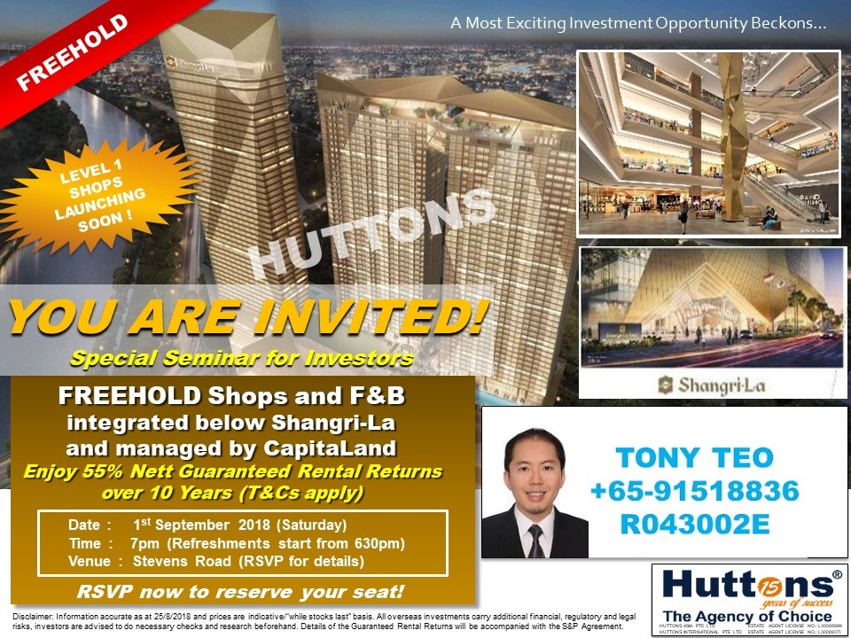 A Superb Investment Opportunity! Rare FREEHOLD Shops for sale from only US$1xxK in a super tall 55-storey mixed development with Shangri-La Hotel, Luxury Apartments and Grade A Offices