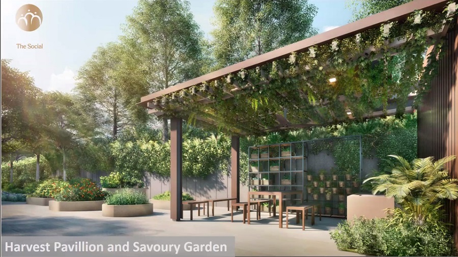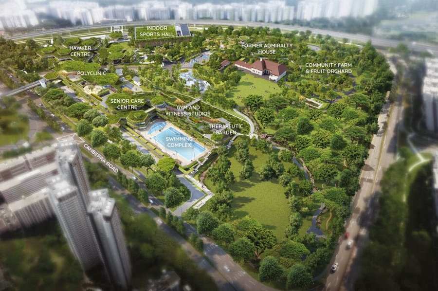 Gym with indoor and outdoor pools and sports facilities, gardens for community farming, as well as hawker centre, polyclinic, and senior care centre