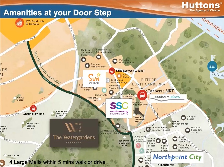 The Watergardens will enjoy easy accessibility to the 118,000 sqft 3-storey Canberra Plaza located next to the Canberra MRT Station. Right across Canberra Walk is the neighbourhood centre with some localised shops, supermarket, foodcourt, enrichment schools and childcare centres.