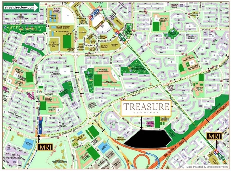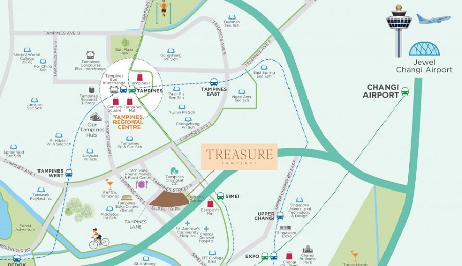 Treasure at Tampines is near to a number of MRT stations such as Simei MRT station and Tampines MRT station. Transportation is expected to grow exponentially in the near future upon the completion of upcoming Tampines East and Tampines West MRT stations along with three new MRT lines and new integrated transport hub. The Tampines Bus Interchange is situated near to the Tampines MRT station. Nevertheless, getting to Treasure at Tampines is effortless with Pan Island Expressway (PIE) Exit 4 and Tampines Expressway (TPE) at doorstep which further link to the new towns of Pasir Ris, Tampines, Punggol and Seletar.