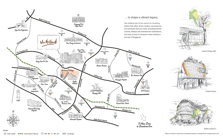 Van Holland is centrally located along Holland Road just opposite to Holland Village and directly connected by sheltered linkway to Holland Village MRT station about 240 meters away (or just 4 minutes walk). The development is within 5 to 10 minutes from major locations such as the main Orchard Road shopping belt, Dempsey Hill and the Singapore Botanic Gardens. Residents will be able to enjoy being in a quiet central location with an MRT Station at their doorstep, and also near to major locations in Singapore. Nearby food establishments include Holland Village and Dempsey Hill.